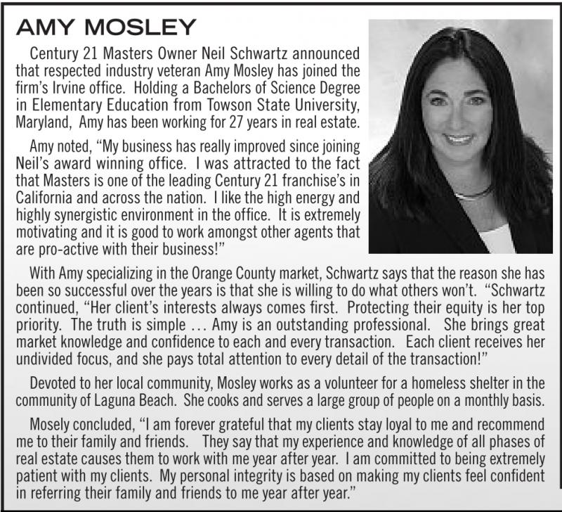 AMY MOSLEY Century 21 Masters Owner Neil Schwartz announced that respected industry veteran Amy Mosley has joined the firm’s Irvine office. Holding a Bachelors of Science Degree in Elementary Education from Towson State University, Maryland, Amy has been working for 27 years in real estate. Amy noted, “My business has really improved since joining Neil’s award winning office. I was attracted to the fact that Masters is one of the leading Century 21 franchise’s in California and across the nation. I like the high energy and highly synergistic environment in the office. It is extremely motivating and it is good to work amongst other agents that are pro-active with their business!” With Amy specializing in the Orange County market, Schwartz says that the reason she has been so successful over the years is that she is willing to do what others won’t. “Schwartz continued, “Her client’s interests always comes first. Protecting their equity is her top priority. The truth is simple … Amy is an outstanding professional. She brings great market knowledge and confidence to each and every transaction. Each client receives her undivided focus, and she pays total attention to every detail of the transaction!” Devoted to her local community, Mosley works as a volunteer for a homeless shelter in the communityofLaguna Beach. She cooks andservesalarge groupofpeopleonamonthly basis. Mosely concluded, “I am forever grateful that my clients stay loyal to me and recommend me to their family and friends. They say that my experience and knowledge of all phases of real estate causes them to work with me year after year. I am committed to being extremely patient with my clients. My personal integrity is based on making my clients feel confident in referring their family and friends to me year after year.”