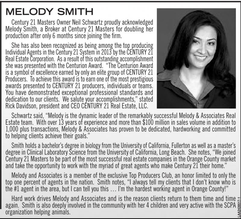 MELODY SMITH Century 21 Masters Owner Neil Schwartz proudly acknowledged Melody Smith, a Broker at Century 21 Masters for doubling her production after only 6 months since joining the firm. She has also been recognized as being among the top producing Individual Agents in theCentury 21 System in 2013 by theCENTURY 21 Real Estate Corporation. As aresultofthisoutstandingaccomplishment shewas presentedwiththe Centurion Award. “The Centurion Award is asymbolofexcellenceearnedbyonlyanelite groupofCENTURY 21 Producers. To achieve this awardistoearnone of themostprestigious awards presented to CENTURY 21 producers, individuals or teams. You have demonstrated exceptional professional standards and dedication to our clients. We salute your accomplishments,” stated Rick Davidson, president and CEO CENTURY 21 Real Estate, LLC. Schwartz said, “Melody is the dynamic leader of the remarkably successful Melody & Associates Real Estate team. With over 13 years of experience and more than $100 million in sales volume in addition to 1,000 plus transactions, Melody & Associates has proven to be dedicated, hardworking and committed to helping clients achieve their goals.” Smithholds abachelor’sdegree in biology from theUniversity of California,Fullerton as well as amaster’s degree in ClinicalLaboratory Science from theUniversity of California,LongBeach. She notes, “Wejoined Century21Masters to be part of themostsuccessfulrealestate companiesinthe Orange County market and take the opportunity to work with the myriad of great agents who make Century 21 their home.” Melody and Associates is a member of the exclusive Top Producers Club, an honor limited to only the top one percent of agents in the nation. Smith notes, “I always tell my clients that I don’t know who is the #1 agent in the area, but I can tell you this … I’m the hardest working agent in Orange County!” Hard work drives Melody and Associates and is the reason clients return to them time and time again. Smith is also deeply involved in the community with her 4 children and very active with the SCPA organization helping animals.