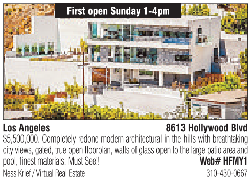 First open Sunday 1-4pm Los Angeles 8613 Hollywood Blvd $5,500,000. Completely redone modern architectural in the hills with breathtaking city views, gated, true open floorplan, walls of glass open to the large patio area and pool, finest materials. Must See!! Web# HFMY1 Ness Krief /Virtual Real Estate 310-430-0667