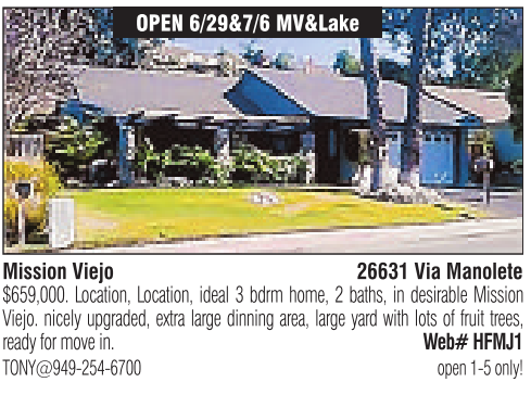 OPEN 6/29&7/6 MV&Lake Mission Viejo 26631 Via Manolete $659,000. Location, Location, ideal 3bdrm home, 2baths, in desirable Mission Viejo. nicely upgraded, extra large dinning area, large yard with lots of fruit trees, ready for move in. Web# HFMJ1 TONY@949-254-6700 open 1-5 only!