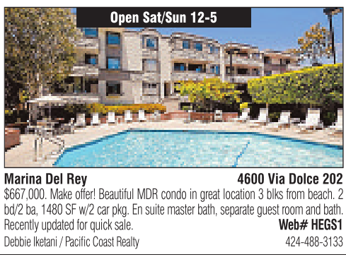 Open Sat/Sun 12-5 Marina Del Rey 4600 Via Dolce 202 $667,000. Make offer! Beautiful MDR condo in great location 3blks from beach. 2 bd/2 ba, 1480 SF w/2 car pkg. En suite master bath, separate guest room and bath. Recently updated for quick sale. Web# HEGS1 Debbie Iketani /Pacific Coast Realty 424-488-3133