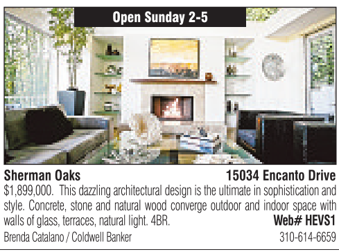 Open Sunday 2-5 Sherman Oaks 15034 Encanto Drive $1,899,000. This dazzling architectural design is the ultimate in sophistication and style. Concrete, stone and natural wood converge outdoor and indoor space with walls of glass, terraces, natural light. 4BR. Web# HEVS1 Brenda Catalano /Coldwell Banker 310-614-6659