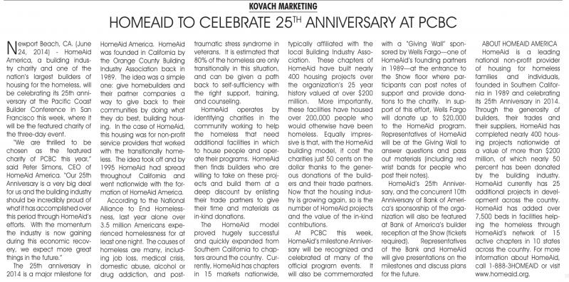 Beach, CA. (June 24, 2014) - HomeAid America, a building industry charity and one of the nation’s largest builders of housing for the homeless, will be celebrating its 25th anniversary at the Pacific Coast Builder Conference in San Francisco this week, where it will be the featured charity of the three-day event.