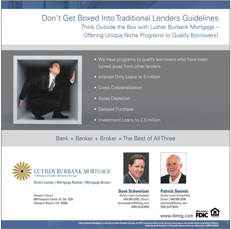 Luther Burbank Mortgage is adivision of Luther Burbank Savings, an FDIC insured privately owned Savings Association with current assets exceeding 3.6 billion.
