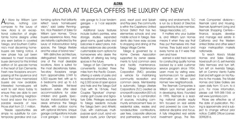 tomizing options that brilliantly reflect luxury homebuyers’ vision,” said Lesley Pennington, Vice President of Sales for William Lyon Homes. “once buyers experience Alora, they are instantly captivated by the luxury of indoor/outdoor living spaces, the Talega lifestyle and the value of brand new.”