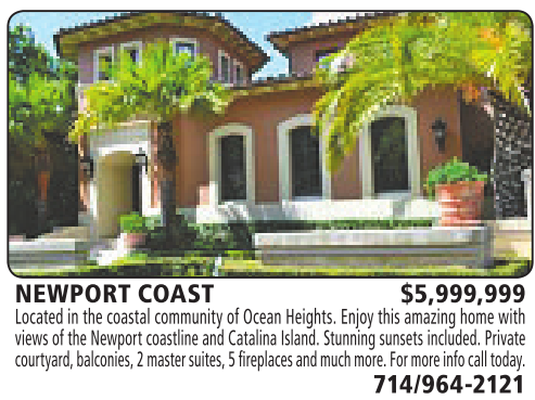 NEWPORT COAST $5,999,999 Located in the coastal community ofOcean Heights. Enjoy this amazing home with views ofthe Newport coastline and Catalina Island. Stunning sunsets included. Private courtyard,balconies, 2master suites, 5fireplaces andmuch more.For more infocalltoday. 714/964-2121