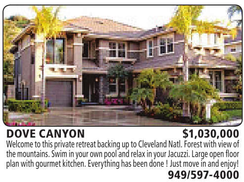 DOVE CANYON $1,030,000 Welcome to this private retreat backinguptoClevelandNatl. Forest with view of themountains.Swiminyour ownpooland relaxinyour Jacuzzi.Large openfloor plan with gourmet kitchen. Everythinghas beendone !Just move in andenjoy! 949/597-4000