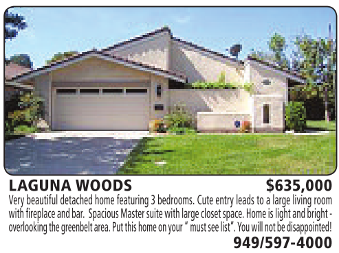 949/597-4000 LAGUNA WOODS $635,000 Very beautiful detached home featuring 3bedrooms. Cute entry leads toalarge living room with fireplace andbar. Spacious Master suite with large closet space.Home is lightand brightoverlooking thegreenbelt area. Put this home on your “must seelist”.You will notbedisappointed! 949/597-4000 See also
