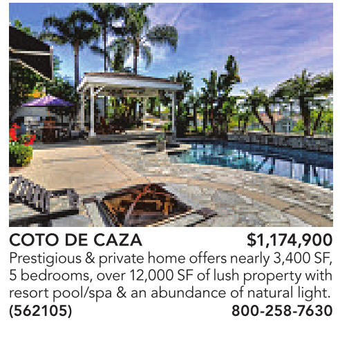 COTO DE CAZA $1,174,900 Prestigious&private home offers nearly 3,400SF, 5bedrooms, over12,000 SF of lush property with resort pool/spa &anabundance of natural light. (562105) 800-258-7630