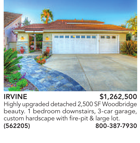 IRVINE $1,262,500 Highlyupgradeddetached2,500 SF Woodbridge beauty. 1 bedroom downstairs, 3-car garage, custom hardscape with fire-pit &largelot. (562205) 800-387-7930