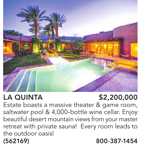 LA QUINTA $2,200,000 Estate boasts a massive theater & game room, saltwater pool & 4,000-bottle wine cellar. Enjoy beautiful desert mountain viewsfrom your master retreat with private sauna! Every room leads to theoutdoor oasis! (562169) 800-387-1454