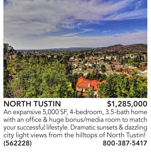 NORTH TUSTIN $1,285,000 An expansive5,000SF, 4-bedroom, 3.5-bath home with an office&hugebonus/media room to match your successfullifestyle.Dramatic sunsets&dazzling citylight viewsfromthe hilltops of North Tustin! (562228) 800-387-5417