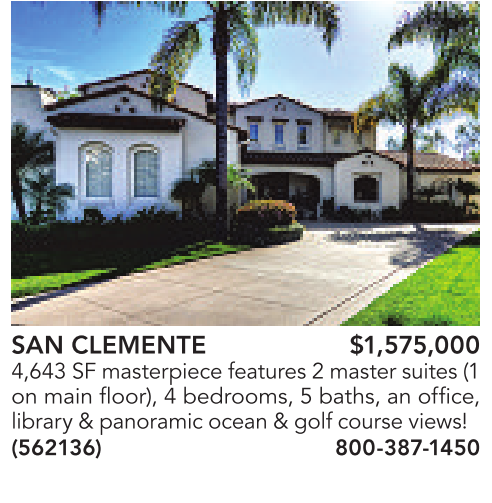 SAN CLEMENTE $1,575,000 4,643SFmasterpiece features2mastersuites(1 on main floor), 4 bedrooms, 5 baths, an office, library&panoramic ocean&golf course views! (562136) 800-387-1450