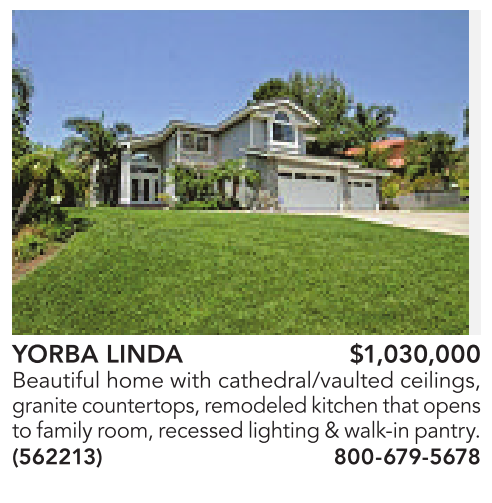 YORBA LINDA $1,030,000 Beautiful home with cathedral/vaulted ceilings, granitecountertops, remodeledkitchen that opens to familyroom,recessed lighting &walk-in pantry. (562213) 800-679-5678