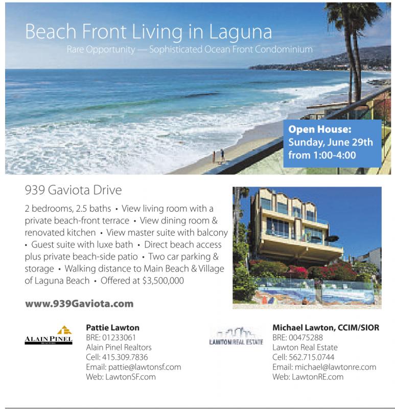 Beach Front Living in Laguna Rare Opportunity—Sophisticated Ocean Front Condominium 939 Gaviota Drive 2bedrooms,2.5 baths • View living room with a privatebeach-front terrace • View dining room & renovated kitchen • View master suitewith balcony • Guest suitewith luxebath • Directbeach access plus privatebeach-side patio • Two car parking & storage • Walking distance to Main Beach &Village of Laguna Beach • Offeredat$3,500,000 www.939Gaviota.com Pattie Lawton BRE: 01233061 Alain Pinel Realtors Cell: 415.309.7836 Email: pattie@lawtonsf.com Web: LawtonSF.com Open House: Sunday, June 29th from 1:00-4:00 Michael Lawton, CCIM/SIOR BRE: 00475288 Lawton Real Estate Cell: 562.715.0744 Email: michael@lawtonre.com Web: LawtonRE.com