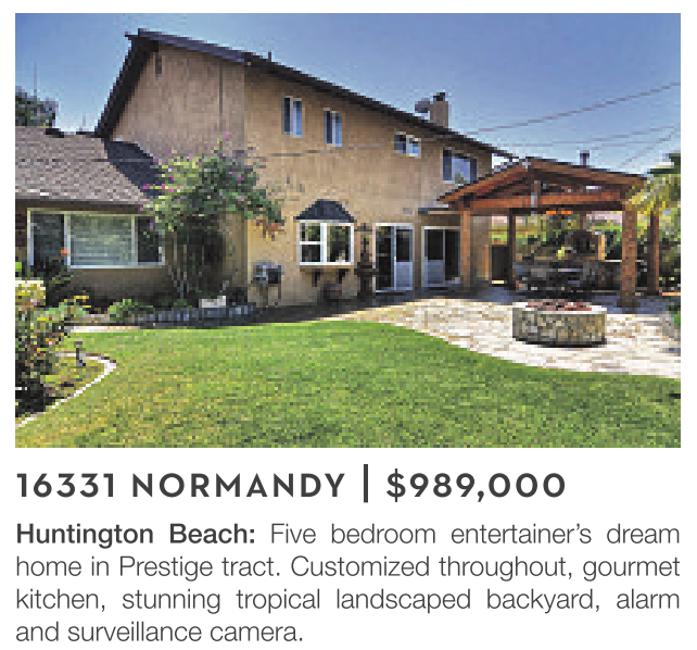 Huntington Beach: Five bedroom entertainer’s dream home in Prestige tract. Customized throughout, gourmet kitchen, stunning tropical landscaped backyard, alarm and surveillance camera.