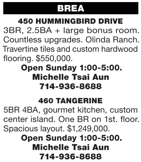 BREA 450 HUMMINGBIRD DRIVE 3BR, 2.5BA + large bonus room. Countless upgrades. Olinda Ranch. Travertine tiles and custom hardwood flooring. $550,000. Open Sunday 1:00-5:00. Michelle Tsai Aun 714-936-8688 460 TANGERINE 5BR 4BA, gourmet kitchen, custom center island. One BR on 1st. floor. Spacious layout. $1,249,000. Open Sunday 1:00-5:00. Michelle Tsai Aun 714-936-8688