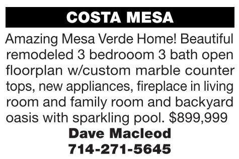 COSTA MESA Amazing Mesa Verde Home! Beautiful remodeled 3 bedrooom 3 bath open floorplan w/custom marble counter tops, new appliances, fireplace in living room and family room and backyard oasis with sparkling pool. $899,999 Dave Macleod 714-271-5645