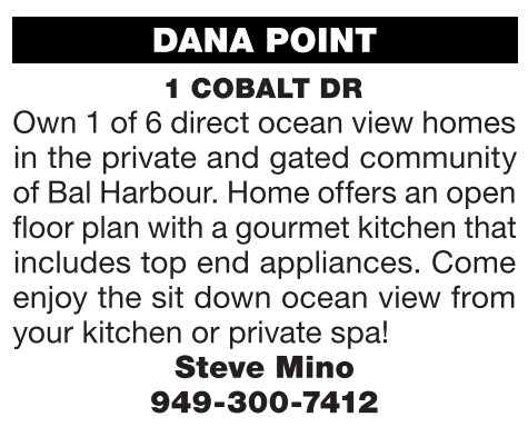 DANA POINT 1 COBALT DR Own 1 of 6 direct ocean view homes in the private and gated community of Bal Harbour. Home offers an open floor plan with a gourmet kitchen that includes top end appliances. Come enjoy the sit down ocean view from your kitchen or private spa! Steve Mino 949-300-7412