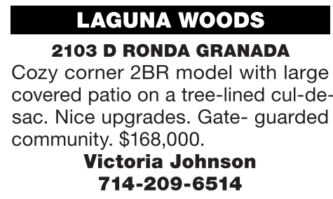 2103 D RONDA GRANADA Cozy corner 2BR model with large covered patio on a tree-lined cul-desac. Nice upgrades. Gate- guarded community. $168,000.