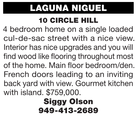 LAGUNA NIGUEL 10 CIRCLE HILL 4 bedroom home on a single loaded cul-de-sac street with a nice view. Interior has nice upgrades and you will find wood like flooring throughout most of the home. Main floor bedroom/den. French doors leading to an inviting back yard with view. Gourmet kitchen with island. $759,000. Siggy Olson 949-413-2689