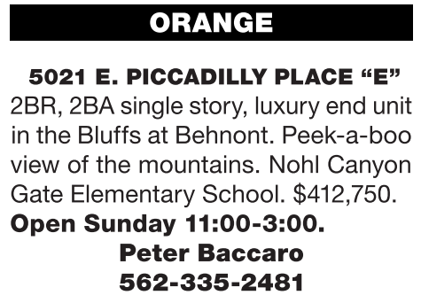 5021 E. PICCADILLY PLACE “E” 2BR, 2BA single story, luxury end unit in the Bluffs at Behnont. Peek-a-boo view of the mountains. Nohl Canyon Gate Elementary School. $412,750.