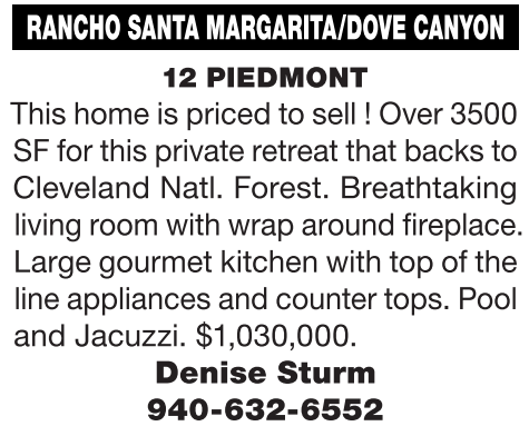 RANCHO SANTA MARGARITA/DOVE CANYON 12 PIEDMONT This home is priced to sell ! Over 3500 SF for this private retreat that backs to Cleveland Natl. Forest. Breathtaking living room with wrap around fireplace. Large gourmet kitchen with top of the line appliances and counter tops. Pool and Jacuzzi. $1,030,000. Denise Sturm 940-632-6552