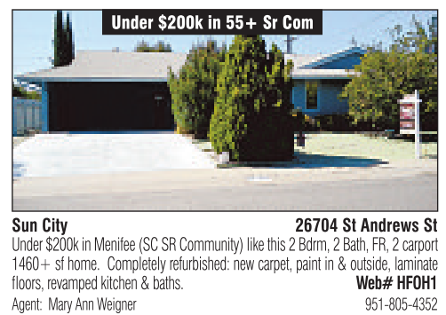 Under $200k in Menifee (SC SR Community) like this 2Bdrm, 2Bath, FR, 2carport 1460+ sf home. Completely refurbished: new carpet, paint in &outside, laminate floors, revamped kitchen &baths. Web# HFOH1 Agent: Mary Ann Weigner 951-805-4352