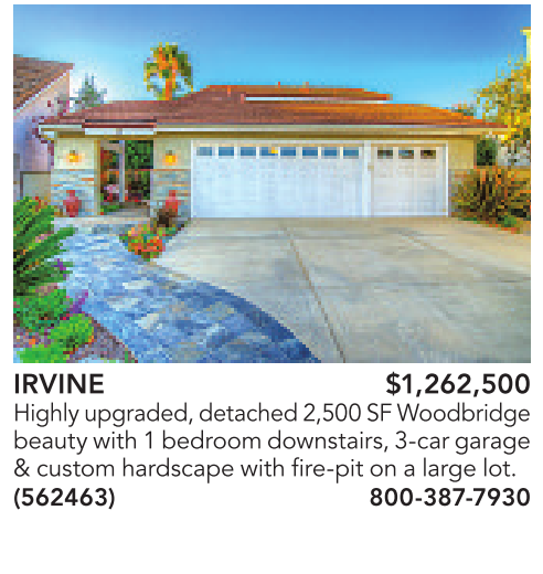 IRVINE $1,262,500 Highlyupgraded, detached 2,500SFWoodbridge beauty with 1bedroom downstairs, 3-cargarage &customhardscapewithfire-pit onalargelot. (562463) 800-387-7930