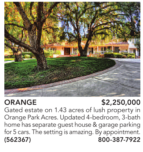 ORANGE $2,250,000 Gated estate on 1.43 acres of lush property in Orange Park Acres. Updated4-bedroom,3-bath home hasseparateguest house&garageparking for5cars. Thesetting is amazing. By appointment. (562367) 800-387-7922