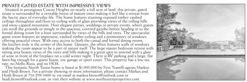 This fantastic North Tustin home is listed at $1,995,000 by First Team® agents Markus and Heidi Brown. For a private showing or more information, please contact Markus and Heidi Brown at 714-299-3400 or via email at markus.brown@outlook.com or heidi.brown@outlook.com, or visit their website at www.northtustinproperties.com.