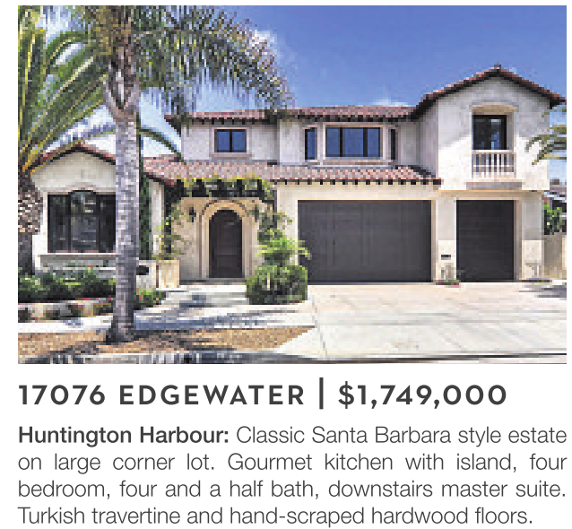 Huntington Harbour: Classic Santa Barbara style estate on large corner lot. Gourmet kitchen with island, four bedroom, four and a half bath, downstairs master suite. Turkish travertine and hand-scraped hardwood floors.