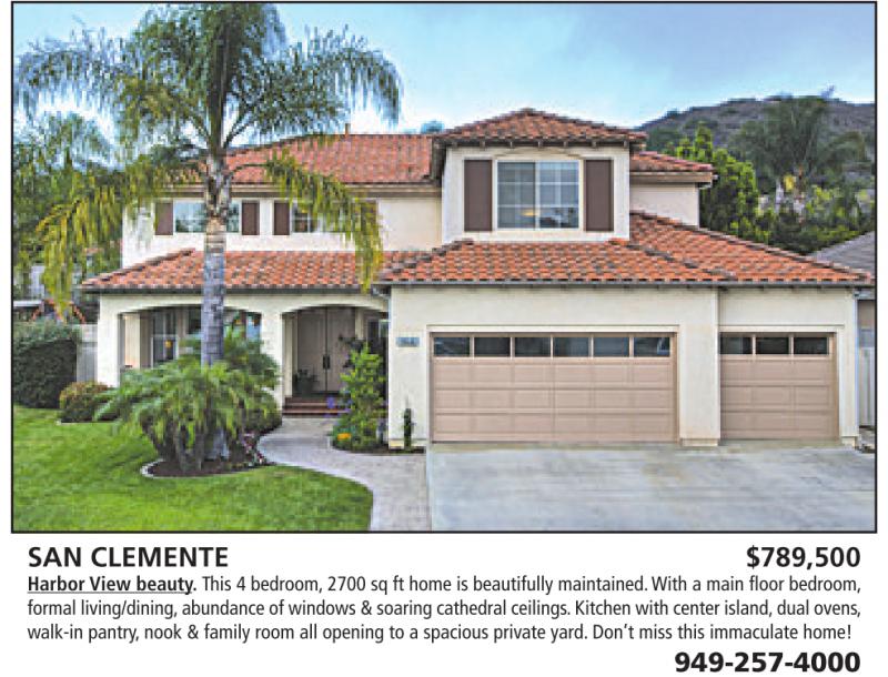 SAN CLEMENTE $789,500 Harbor View beauty. This 4bedroom, 2700 sq ft home is beautifullymaintained. With amain floor bedroom, formal living/dining, abundanceofwindows & soaring cathedral ceilings. Kitchen with centerisland, dual ovens, walk-in pantry,nook &family room all openingtoaspacious private yard. Don’t miss this immaculatehome! 949-257-4000