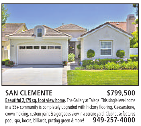 SAN CLEMENTE $799,500 Beautiful2,179 sq. foot view home. TheGallery at Talega. This singlelevel home