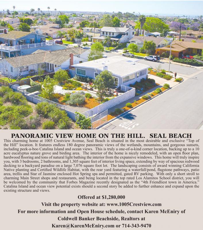 PANORAMIC VIEW HOME ON THE HILL. SEAL BEACH This charming home at 1005 Crestview Avenue, Seal Beach is situated in the most desirable and exclusive “Top of the Hill” location. It features endless 180 degree panoramic views of the wetlands, mountains, and gorgeous sunsets, including peek-a-boo Catalina Island and ocean views. This is truly a one-of-a-kind corner location, backing up to a 10 acre eucalyptus nature grove and birding area. The interior of the home is nicely remodeled, with an open floor plan, hardwood flooring and tons of natural light bathing the interior from the expansive windows. This home will truly inspire you, with 3 bedrooms, 2 bathrooms, and 1,305 square feet of interior living space, extending by way of spacious redwood decking to a backyard paradise on a large 7,076 square foot lot. The landscaping consists of award winning California Native planting and Certified Wildlife Habitat, with the rear yard featuring a waterfall/pond, flagstone pathways, patio area, trellis and Star of Jasmine enclosed Hot Spring spa and permitted, gated RV parking. With only a short stroll to charming Main Street shops and restaurants, and being located in the top rated Los Alamitos School district, you will be welcomed by the community that Forbes Magazine recently designated as the “4th Friendliest town in America.” Catalina Island and ocean view potential exists should a second story be added to further enhance and expand upon the existing structure and views. Offered at $1,280,000 Visit the property website at: www.1005Crestview.com For more information and Open House schedule, contact Karen McEniry of Coldwell Banker Beachside, Realtors at Karen@KarenMcEniry.com or 714-343-9470