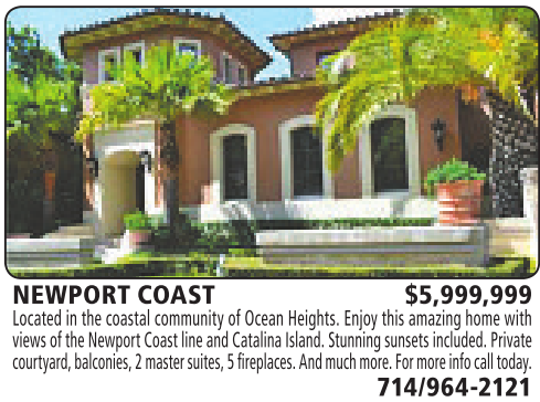 NEWPORT COAST $5,999,999 Located in the coastal community ofOcean Heights. Enjoy this amazing home with viewsofthe NewportCoast line andCatalinaIsland.Stunningsunsetsincluded. Private courtyard,balconies, 2master suites, 5fireplaces. Andmuch more.For more infocalltoday. 714/964-2121 See also