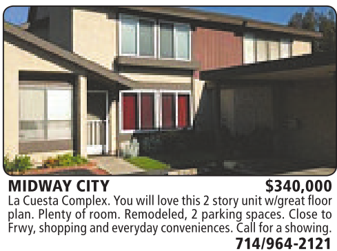 MIDWAY CITY $340,000 La Cuesta Complex. Youwill love this 2story unit w/great floor plan. Plenty of room. Remodeled, 2parking spaces. Close to Frwy,shoppingand everyday conveniences. Call forashowing.
