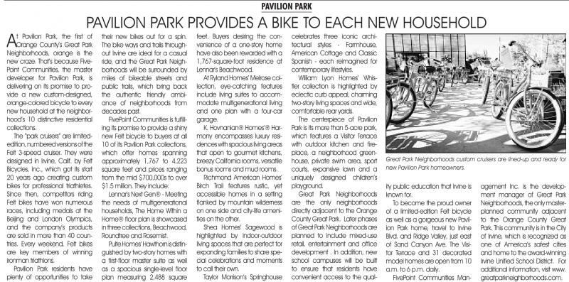 To become the proud owner of a limited-edition Felt bicycle as well as agorgeous new Pavilion Park home, travel to Irvine Blvd. and ridge valley, just east of Sand Canyon Ave. The visitor Terrace and 31 decorated model homes are open from 10 a.m. to 6p.m. daily.