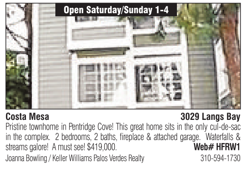 Costa Mesa Open Saturday/Sunday 1-4 3029 Langs Bay Joanna Bowling /Keller Williams Palos Verdes Realty 310-594-1730 Pristine townhome in Pentridge Cove! This great home sits in the only cul-de-sac in the complex. 2bedrooms, 2baths, fireplace &attached garage. Waterfalls & streams galore! Amust see! $419,000. Web# HFRW1