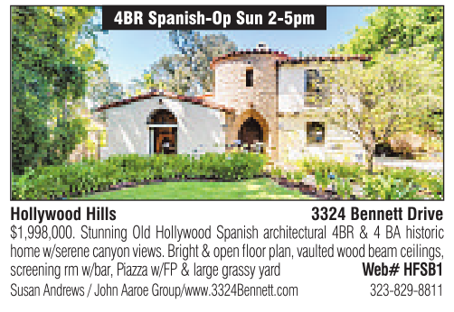 Hollywood Hills 4BR Spanish-Op Sun 2-5pm 3324 Bennett Drive Susan Andrews /John Aaroe Group/www.3324Bennett.com 323-829-8811 $1,998,000. Stunning Old Hollywood Spanish architectural 4BR &4BAhistoric home w/serene canyon views. Bright &open floor plan, vaulted wood beam ceilings, screening rm w/bar,Piazza w/FP &large grassy yard Web# HFSB1