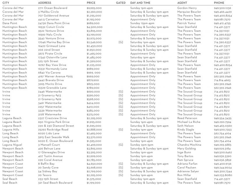 CITY ADDRESS PRICE GATED DAY AND TIME AGENT PHONE Corona del Mar 2711 Ocean Boulevard $9,995,000 Sunday 1pm-4pm Gordon Henry 949.500.1236 Corona del Mar 3 Malibu Circle $2,260,000 Saturday & Sunday 1pm-4pm Marquise Beucler 949.466.4429 Corona del Mar 707 Goldenrod Avenue $1,295,000 Saturday & Sunday 1pm-4pm The Powers Team 949.400.8254 Corona del Mar 441.5 Carnation $1,195,000 Appointment Only The Powers Team 949.981.7570 Dana Point 24736 Dana Point Drive $689,000 Sunday 12pm-4pm Patrick Yumui 949.412.4755 Huntington Beach 16532 Cotuit Circle $4,500,000 Saturday & Sunday 1pm-4pm Sean Stanfield 714.421.3377 Huntington Beach 3522 Venture Drive $3,895,000 Appointment Only The Powers Team 714.357.1031 Huntington Beach 16592 Nalu Circle $3,199,000 Appointment Only The Powers Team 714.390.6337 Huntington Beach 3542 Venture Drive $2,975,000 Saturday & Sunday 1pm-4pm The Powers Team 714.357.1031 Huntington Beach 17046 Marina Bay Drive $2,549,000 [G] Saturday 1pm-4pm The Powers Team 714.390.6337 Huntington Beach 16422 Grimaud Lane $2,450,000 Saturday & Sunday 1pm-4pm Sean Stanfield 714.421.3377 Huntington Beach 206 22nd Street $1,950,000 Saturday & Sunday 1pm-4pm Sean Stanfield 714.421.3377 Huntington Beach 3672 Pirate Circle $1,495,000 Appointment Only The Powers Team 714.357.1031 Huntington Beach 17342 Osterville Lane $1,485,000 Saturday 1pm-4pm Sean Stanfield 714.421.3377 Huntington Beach 525 15th Street $1,399,000 Saturday & Sunday 1pm-4pm Sean Stanfield 714.421.3377 Huntington Beach 16767 Bay View Drive $1,225,000 Appointment Only The Powers Team 949.400.8254 Huntington Beach 16331 Normandy Lane $989,000 Saturday & Sunday 1pm-4pm Sean Stanfield 714.421.3377 Huntington Beach 6842 Via Carona $969, 000 Saturday & Sunday 1pm-4pm Sean Stanfield 714.421.3377 Huntington Beach 4167 Warner Avenue #205 $969,000 Appointment Only The Powers Team 562.592.2946 Huntington Beach 3442 Bravata Drive $879,900 Appointment Only The Powers Team 714.814.4663 Huntington Beach 3265 Moritz Drive $825,000 Appointment Only The Powers Team 562.592.2946 Huntington Beach 16329 Grenoble Lane $789,000 Appointment Only The Powers Team 562.592.2946 Irvine 2446 Watermarke $690,000 [G] Appointment Only The Soussé Group 714.412.8512 Irvine 21 Gramercy #413 $596,000 [G] Appointment Only The Soussé Group 714.412.8512 Irvine 21 Gramercy #419 $568,000 [G] Appointment Only The Soussé Group 714.412.8512 Irvine 3461 Watermarke $424,000 [G] Appointment Only The Soussé Group 714.412.8512 Irvine 2257 Watermarke $410,000 [G] Appointment Only The Soussé Group 714.412.8512 Irvine 3339 Watermarke $385,000 [G] Appointment Only The Soussé Group 714.412.8512 Irvine 3128 Watermarke $375,000 [G] Appointment Only The Soussé Group 714.412.8512 Laguna Beach 2327 Crestview Drive $2,295,000 Saturday & Sunday 1pm-4pm Reed Peterson 949.554.3435 Laguna Beach 650 Virginia Park Drive $1,995,000 Sunday 1pm-4pm Michael La Riche 949.290.7594 Laguna Beach 220 & 230 Diamond Street $1,695,000 Saturday & Sunday 1pm-4pm Seth Nelson 949.463.0360 Laguna Hills 25292 Rockridge Road $2,888,000 [G] Sunday 1pm-4pm Kindy Slagle 949.500.7353 Long Beach 6020 Lido Lane $7,495,000 Appointment Only The Powers Team 562.754.4104 Long Beach 5915 East Seaside Walk $3,570,000 Appointment Only The Powers Team 562.592.2946 Long Beach 6020 E. Ocean Boulevard $1,595,000 Sunday 1pm-4pm The Powers Team 562.754.4104 Laguna Niguel 3 Mansell Court $2,499,000 [G] Sunday 2pm-5pm Chandra Mochina 949.293.5883 Newport Beach 426 Belvue Lane $3,895,000 Saturday & Sunday 1pm-4pm Mary Golding 949.929.3184 Newport Beach 17 Gleneagles Drive $3,595,000 Sunday 1pm-4pm Inge Bunn 949.500.6462 Newport Beach 407 Tustin Avenue $2,999,000 Sunday 1pm-4pm Tony Bartos 949.939.3390 Newport Beach 220 Coral Avenue $2,785,000 Sunday 1pm-4pm Pam Spruce 949.636.3859 Newport Coast 8 Baffin Bay $4,650,000 [G] Saturday & Sunday 1pm-4pm Adriana Farfan 949.400.9136 Newport Coast 20 Sandy Cove $3,698,000 [G] Sunday 1pm-4pm Carol Paulsen 949.244.9024 Newport Coast 54 Sidney Bay $2,799,000 [G] Saturday & Sunday 1pm-4pm Adrienne Salyer 949.300.7344 Newport Coast 20 Tesoro $2,295,000 [G] Sunday 1pm-4pm Ron Millar 949.233.8080 Seal Beach 233 15th Street $1,375,000 Saturday 1pm-4pm Sean Stanfield 714.421.3377 Seal Beach 321 Seal Beach Boulevard $1,199,000 Saturday & Sunday 1pm-4pm The Powers Team 949.981.7570