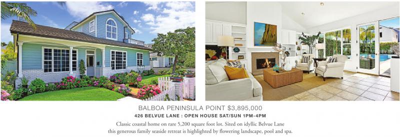 426 BELVUE LANE : OPEN HOUSE SAT/SUN 1PM-4PM Classic coastal home on rare 5,200 square foot lot. Sited on idyllic Belvue Lane this generous family seaside retreat is highlighted by flowering landscape, pool and spa.