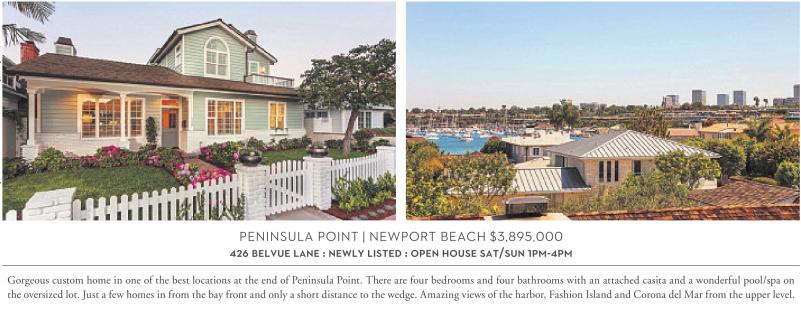 PENINSULA POINT | NEWPORT BEACH $3,895,000 426 BELVUE LANE : NEWLY LISTED : OPEN HOUSE SAT/SUN 1PM-4PM Gorgeous custom home in one of the best locations at the end of Peninsula Point. There are four bedrooms and four bathrooms with an attached casita and a wonderful pool/spa on the oversized lot. Just a few homes in from the bay front and only a short distance to the wedge. Amazing views of the harbor, Fashion Island and Corona del Mar from the upper level.