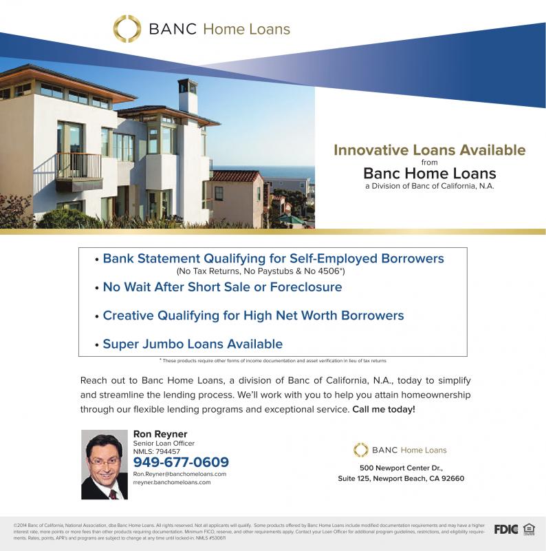 ©2014 Banc of California, National Association, dba Banc Home Loans. All rights reserved. Not all applicants will qualify. Some products offered by Banc Home Loans include modified documentation requirements and may have ahigher interest rate, more points or more fees than other products requiring documentation. Minimum FICO, reserve, and other requirements apply. Contact your Loan Officer for additional program guidelines, restrictions, and eligibility requirements. Rates, points, APR’s and programs are subject to change at any time until locked-in. NMLS #530611