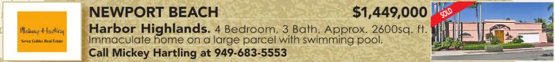 Seven Gables Real Estate NEWPORT BEACH $1,449,000 Harbor Highlands. 4 Bedroom, 3 Bath, Approx. 2600sq. ft. Immaculate home on a large parcel with swimming pool. C Immaculate home on a large parcel with swimming pool. Call Mickey Hartling at 949-683-5553