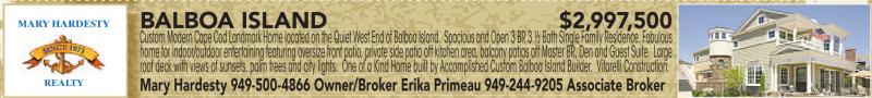MARY HARDESTY REALTY BALBOA ISLAND $2,997,500 B CCustom ModernCapeCod Landmark Home locatedonthe Quiet West EndofBalboa Island. Spacious andOpen3BR3½Bath Single Family Residence.Fabulous homefor indoor/outdoor entertaining featuring oversizefront patio,private private side patio offkitchen area, balconypatiosoff off Master BR,Den andGuest Suite. Large roof deck with views ofsunsets,palmtrees andcitylights. One of aKindHome builtbyAccomplishedCustomBalboa IslandBuilder, Vitarelli Construction. Mary Hardesty 949-500-4866 Owner/Broker Erika Primeau 949-244-9205 Associate Broker