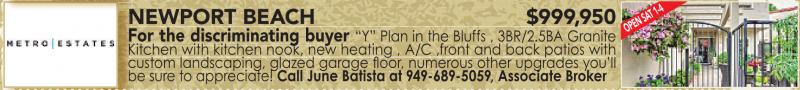 NEWPORT BEACH $999,950 For the discriminating buyer “Y” Plan in the Bluffs , 3BR/2.5BA Granite F Kitchen with kitchen nook, new heating , A/C ,front and back patios with Kitchen with kitchen nook, new heating , A/C ,front and back patios with custom landscaping, glazed garage floor, numerous other upgrades you’ll be sure to appreciate! Call June Batista at 949-689-5059, Associate Broker
