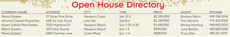 Open House Directory Open House Directory COMPANY NAME ADDRESS CITY TIME PRICE AGENT PHONE# Metro Estates 37 Silver Pine Drive Newport Coast Sat 12-3 $2,395,000 Andrew Nahin 949.338.3916 Abrams Coastal Properties 648 Via Lido Soud Lido Isle Sat/Sun $2,389,900 Don Abrams 714.325.9055 Seven Gables Real Estate 1525 Highland Dr. Newport Beach Sun 1:30-4:30 $1,449,000 Mickey Hartling 949.683.5553 Metro Estates 429 Vista Suerte Newport Beach Sat 1-4 $999,950 June Batista 949.689.5059 Metro Estates 2489 Parmley Lane Costa Mesa Sun 1-4 $888,900 Tracy Stier 949.241.5591