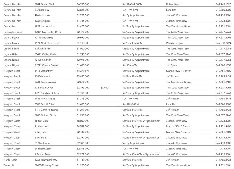 Corona Del Mar 426 Narcissus $1,785,000 Sat By Appointment Jason C. Bradshaw 949.433.3001 Corona Del Mar 426 Narcissus $1,785,000 Sun 1PM-4PM Jason C. Bradshaw 949.433.3001 Costa Mesa 1828 Jamaica Road $1,475,000 Sat/Sun By Appointment The Carmichael Group 714.751.2181 Huntington Beach 17031 Marina Bay Drive $2,495,000 Sat/Sun By Appointment The Coté/Vasu Team 949.677.5268 Laguna Beach 121 Emerald Bay $6,695,000 Sat/Sun By Appointment The Coté/Vasu Team 949.677.5268 Laguna Beach 1571 North Coast Hwy $1,190,000 Sat/Sun 1PM-4PM Wendy Hooper 949.870.2424 Laguna Beach 5Blue Lagoon $1,060,000 Sat/Sun By Appointment The Coté/Vasu Team 949.677.5268 Laguna Hills 25411 Gallup Circle $1,949,000 Sat/Sun By Appointment The Coté/Vasu Team 949.677.5268 Laguna Niguel 22 Asilomar Rd $2,998,000 Sat/Sun By Appointment The Coté/Vasu Team 949.677.5268 Laguna Niguel 31791 Greens Pointe $1,450,000 Sat 1PM-4PM Jan Byrne 949.280.6350 Newport Beach 1914 Oceanfront $4,379,898 Sat/Sun By Appointment Marcus “Kiwi” Gualter 949.751.9600 Newport Beach 108 Via Havre $3,445,000 Sat/Sun 1PM-4PM Jeff Pittman 714.785.4434 Newport Beach 2331 Tustin Avenue $2,595,000 Sat/Sun By Appointment The Carmichael Group 714.751.2181 Newport Beach 43 Balboa Coves $2,395,000 $7,900 Sat/Sun By Appointment The Coté/Vasu Team 949.677.5268 Newport Beach 1720 Candlestick Lane $1,795,000 Sat/Sun By Appointment The Coté/Vasu Team 949.677.5268 Newport Beach 1943 Port Claridge $1,795,000 Sun 1PM-4PM Jeff Pittman 714.785.4434 Newport Beach 2303 Fairhill Drive $1,489,000 Sat 12PM-4PM Lana Fish 949.280.3000 Newport Beach 3119 Corte Portofino $1,299,000 Sat/Sun 1PM-4PM Jeff Pittman 714.785.4434 Newport Beach 2207 Golden Circle $1,238,000 Sat/Sun By Appointment The Coté/Vasu Team 949.677.5268 Newport Coast 16 Sail Vista $8,000,000 Sat/Sun 1PM-4PM w/Appointment Jason C. Bradshaw 949.433.3001 Newport Coast 31 Vista Luci $4,588,000 Sat/Sun By Appointment Marcus “Kiwi” Gualter 949.751.9600 Newport Coast 5Wayside $2,488,000 Sat/Sun By Appointment Marcus “Kiwi” Gualter 949.751.9600 Newport Coast 5Veranda $2,395,000 Sat/Sun 1PM-4PM w/Appointment Jason C. Bradshaw 949.433.3001 Newport Coast 29 Shadowcast $2,395,000 Sat By Appointment Jason C. Bradshaw 949.433.3001 Newport Coast 29 Shadowcast $2,395,000 Sun 1PM-4PM Jason C. Bradshaw 949.433.3001 Newport Coast 1Tuscan Blue $2,277,000 Sat/Sun 1PM-4PM w/Appointment Jason C. Bradshaw 949.433.3001 North Tustin 1261 Triumphal Way $1,149,000 Sat/Sun 1PM-4PM Jeff Pittman 714.785.4434 Temecula 38025 Dorothy Court $1,200,000 Sat/Sun By Appointment The Carmichael Group 714.751.2181