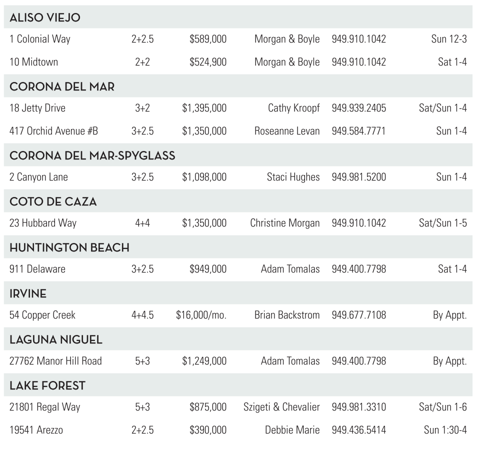 ALISO VIEJO 1Colonial Way 2+2.5 $589,000 Morgan &Boyle 949.910.1042 Sun 12-3 10 Midtown 2+2 $524,900 Morgan &Boyle 949.910.1042 Sat 1-4 CORONA DEL MAR 18 Jetty Drive 3+2 $1,395,000 Cathy Kroopf 949.939.2405 Sat/Sun 1-4 417 Orchid Avenue #B 3+2.5 $1,350,000 Roseanne Levan 949.584.7771 Sun 1-4 CORONA DEL MAR-SPYG SS 2Canyon Lane 3+2.5 $1,098,000 Staci Hughes 949.981.5200 Sun 1-4 COTO DE CAZA 23 Hubbard Way 4+4 $1,350,000 Christine Morgan 949.910.1042 Sat/Sun 1-5 HUNTINGTONBEACH 911 Delaware 3+2.5 $949,000 Adam Tomalas 949.400.7798 Sat 1-4 IRVINE 54 Copper Creek 4+4.5 $16,000/mo. Brian Backstrom 949.677.7108 By Appt. GUNA NIGUEL 27762 Manor Hill Road 5+3 $1,249,000 Adam Tomalas 949.400.7798 By Appt. KE FOREST 21801 Regal Way 5+3 $875,000 Szigeti &Chevalier 949.981.3310 Sat/Sun 1-6 19541 Arezzo 2+2.5 $390,000 Debbie Marie 949.436.5414 Sun 1:30-4